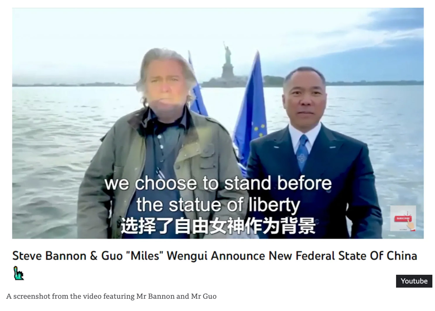 On 4 June 2020, the thirty-first anniversary of the 1989 Tiananmen massacre, and amid the Covid-19 pandemic, Guo and Bannon announced the ‘New Federal State of China’ (NFSC 2024). The launch took place not in the centre of Beijing, but on a luxury yacht bobbing in front of New York’s Statue of Liberty. ‘We Chinese cannot live in a dream anymore! Stop dreaming!’ Guo thundered, while Bannon, poker-faced, recited the English manifesto of the movement, tweaking ‘terrorist’ into the more marketable ‘criminal’ when referring to the Chinese Communist Party (CCP). Even Bannon, connoisseur of political theatre, seemed caught off-guard when Guo bit his own finger until it bled and stamped the manifesto with a bloody seal—proof of revolutionary sincerity, or perhaps a casting call for a horror film about feudalist China. At that moment, a bolt of lightning split the New York sky, which Guo improvised as ‘God’s reply’ and ‘a sign from Tiananmen’s departed souls’.