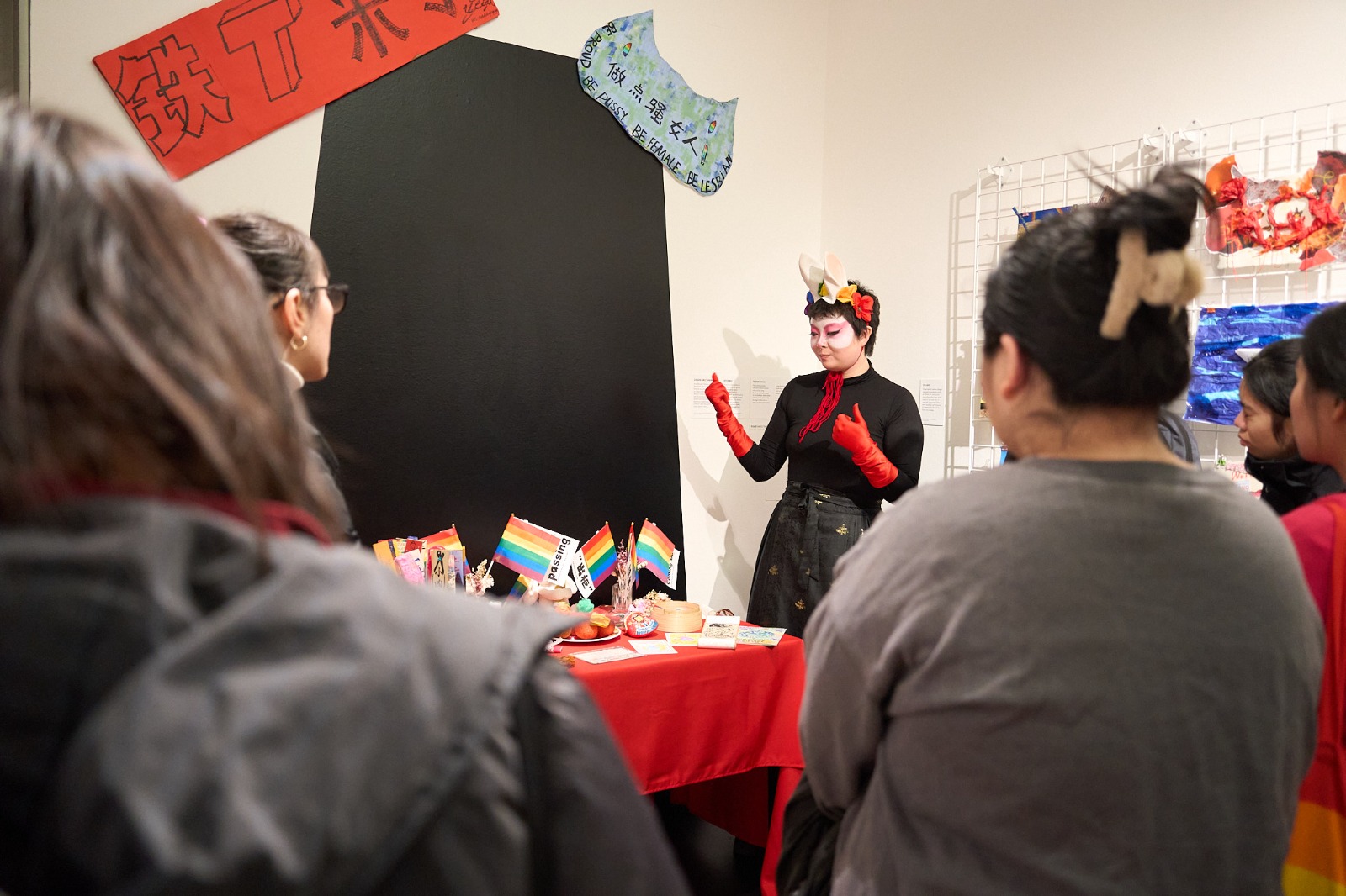 As part of the residency program, the group set up an exhibition titled ‘We Are LGBTQIA+ ESEA’. The centrepiece of the exhibition was a queer shrine, with joss sticks, red packets, oranges, and a rainbow flag. The exhibition also featured a series of nüshu (women’s script) artworks addressing contemporary feminist issues. For the opening night and the Lantern Festival celebration, a Rabbit God, performed by artist FJ (they/them), appeared, telling their story of the Rabbit God and guiding visitors through the exhibition. FJ’s Rabbit God was an androgynous, nonbinary, and trans person. In the opening night performance, FJ held a white balloon on which the Chinese character 家 (‘home’ or ‘family’) was written. FJ wrestled with the balloon, which eventually burst, symbolising the complex and often difficult relationships between queer people and their natal families. When I interviewed them later, FJ told me: